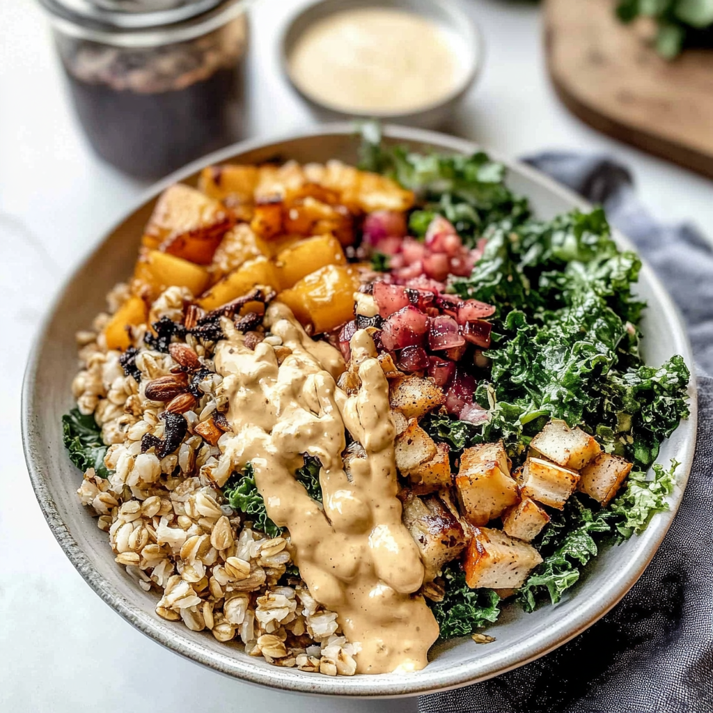 Indulge in a nourishing bowl filled with hearty grains, roasted sweet potatoes, vibrant vegetables, and a creamy maple tahini dressing that elevates every bite.