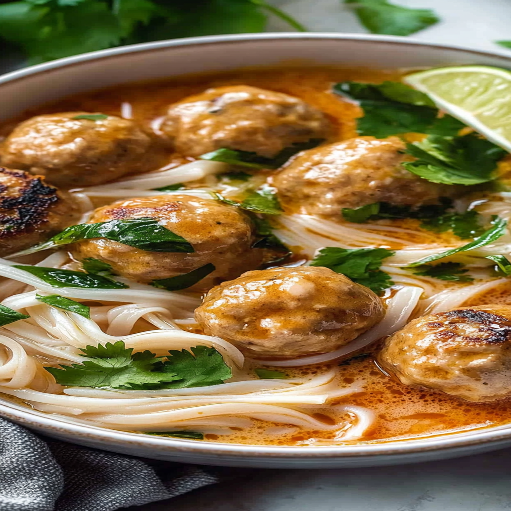 Thai coconut meatballs with rice noodles are a delicious dish that combines flavorful meatballs made from ground meat, herbs, and coconut milk, served over soft rice noodles. This dish typically features a mix of spices that give it a unique Thai twist. The combination of the savory meatballs and the tender noodles creates a delightful meal that’s both comforting and refreshing.
