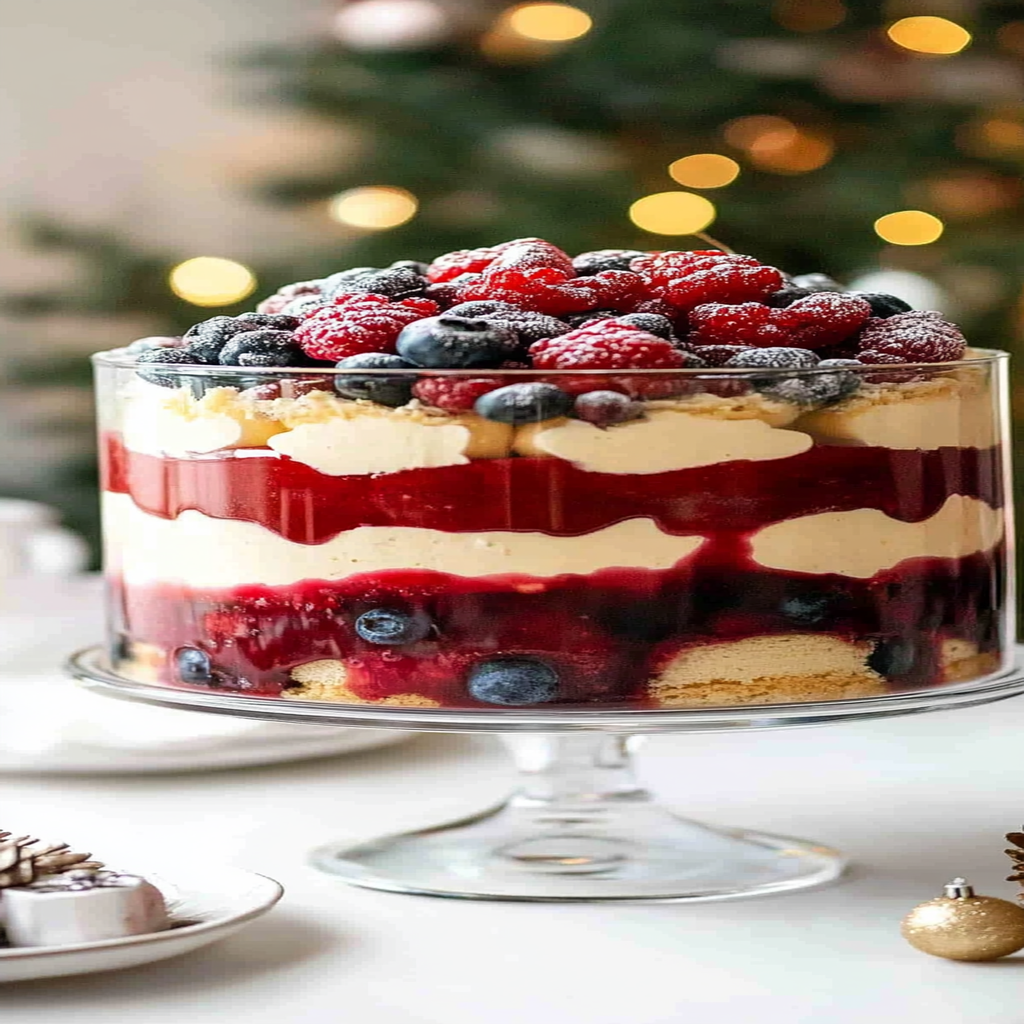 This Christmas Festive Trifle features layers of creamy vanilla custard, mixed berries, and fluffy whipped cream, creating a stunning dessert that dazzles at holiday gatherings.