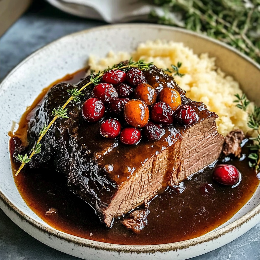 Indulge in a tender, flavorful slow-braised beef roast drizzled with a sweet-tart cranberry balsamic glaze. This comforting dish is perfect for gatherings or family dinners.