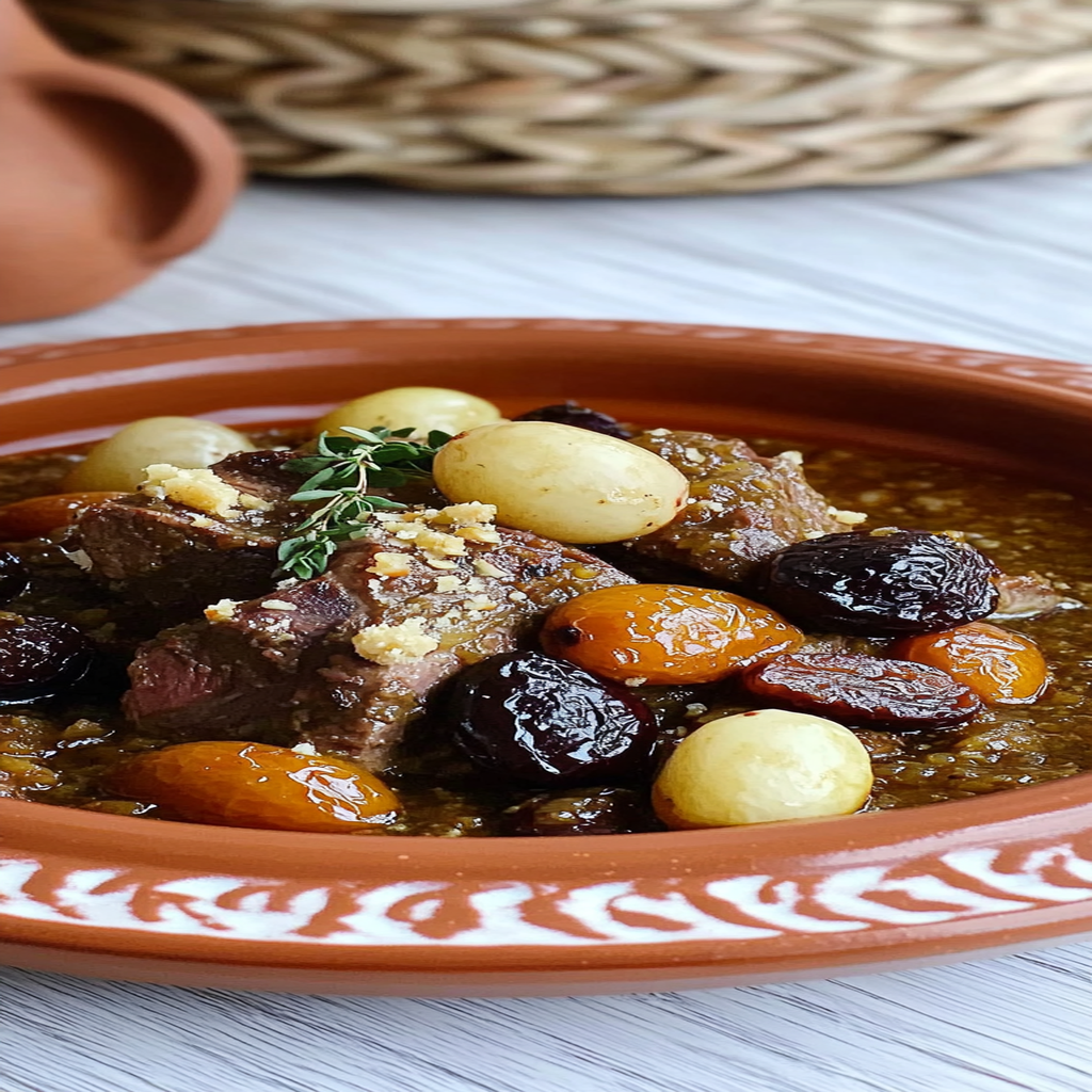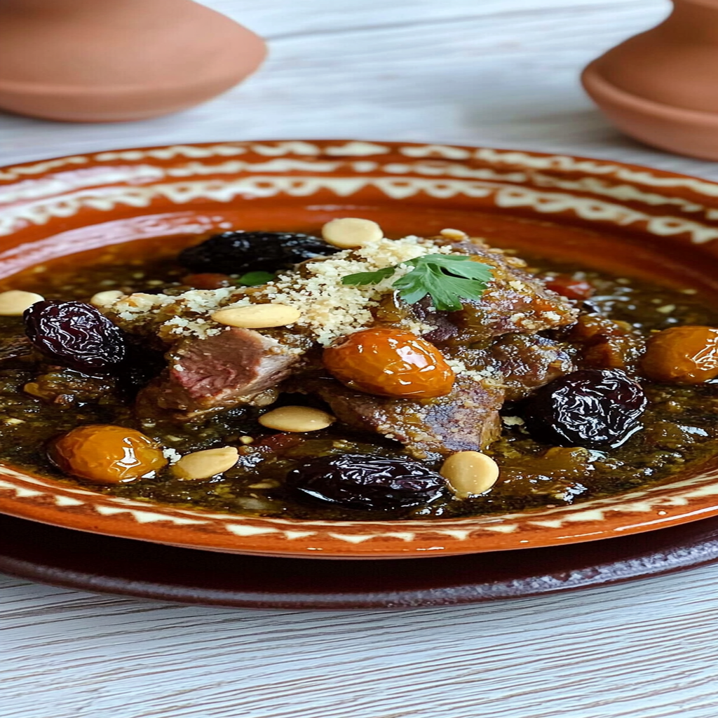 Experience a delightful blend of tender lamb, sweet prunes, and crunchy almonds, all slow-cooked to perfection for a cozy and aromatic meal.