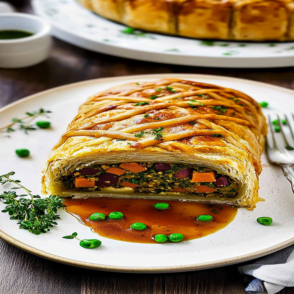 Delight in the warm, savory flavors of Vegetarian Wellington, a flaky pastry enveloping a delicious medley of vegetables and nuts—perfect for festive gatherings or cozy family dinners.