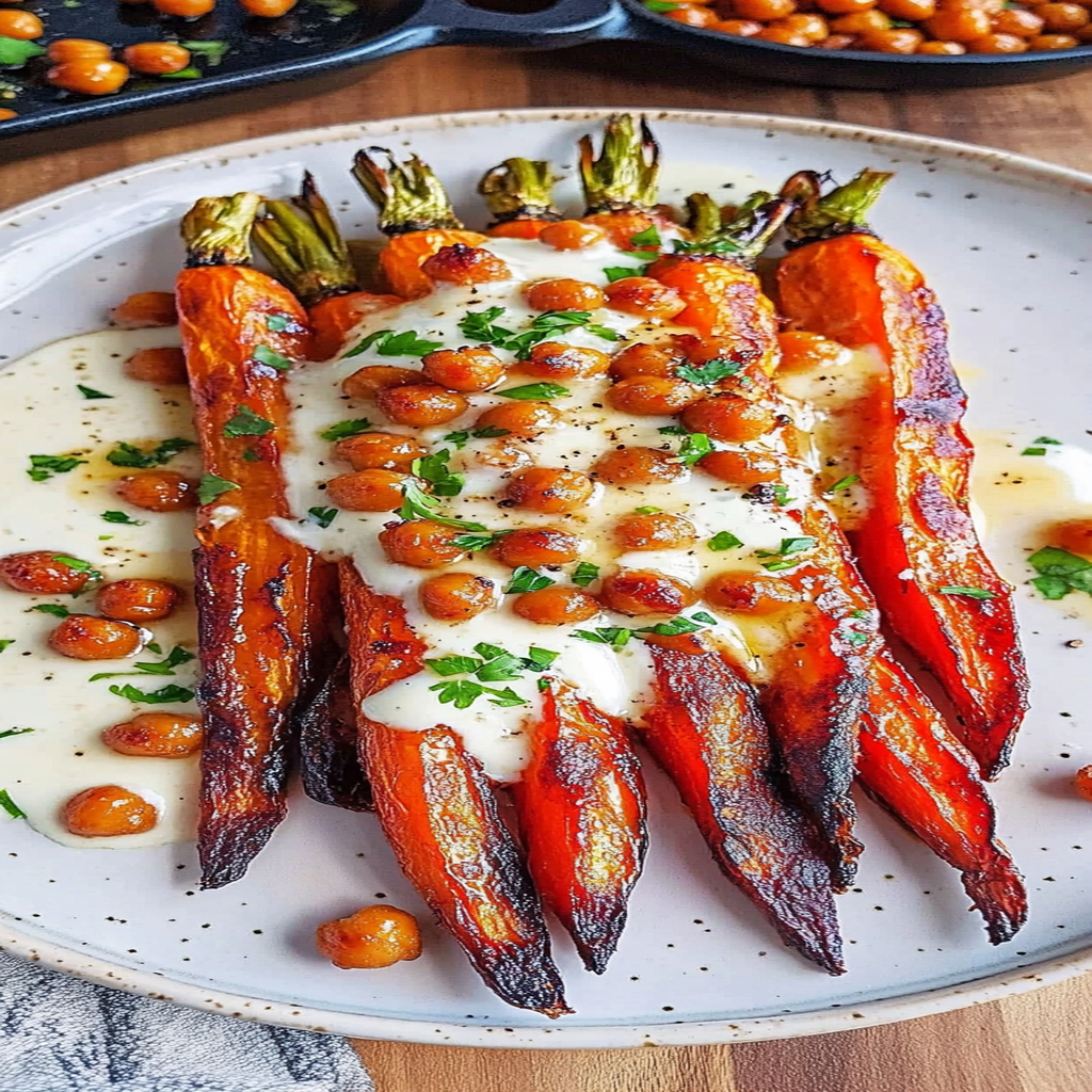 Indulge in the vibrant flavors of roasted carrots glazed with a spicy maple syrup, paired with crunchy chickpeas and creamy yogurt sauce. A delightful dish perfect for any occasion!