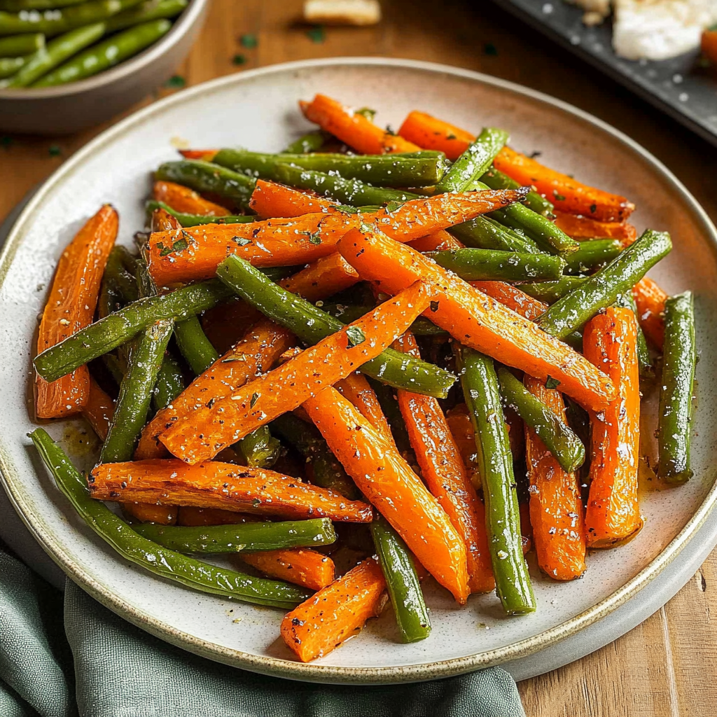 Elevate your meals with this vibrant medley of roasted carrots and green beans, perfectly seasoned and easy to prepare for any occasion.